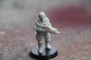 Actual Colonel Meal Radec model. The rest of his squad wear the slightly odd shaped helmets indicating that they are higher value, more elite types. In the game, Radec is armed with an SMG, so you can see the little divergences to ensure that no IP is enfringed. So these guys with the odd helmets are on the Brick of Scrutiny, and the other guys are arrayed below